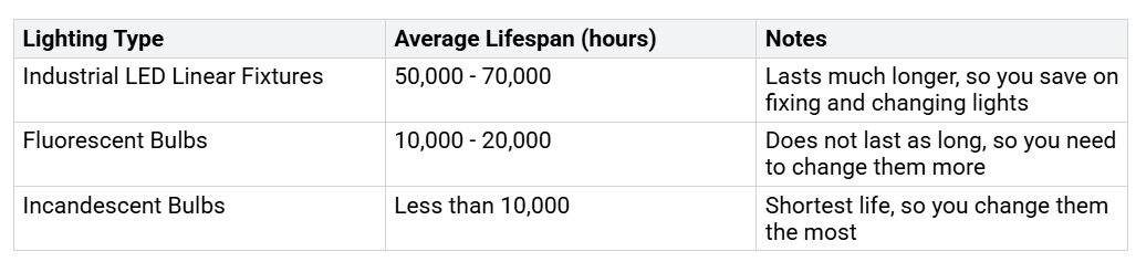 Kung ang mga pabrika ay lumipat sa LED linear lighting, maaari nilaMakatipid ng 60% hanggang 80% sa enerhiya. Ang mga pagtitipid na ito ay malaki para sa mga lugar na manatiling bukas sa mahabang panahon.