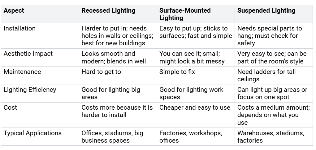 Ang pag -iilaw ng linear ay dumating sa ilang pangunahing uri. Ang bawat uri ay pinakamahusay na gumagana para sa iba't ibang mga lugar at pangangailangan. Ang tatlong pangunahing uri ay naka-mount sa ibabaw, recessed, at nasuspinde. Ang bawat isa ay may sariling magagandang puntos para sa mga puwang ng negosyo.