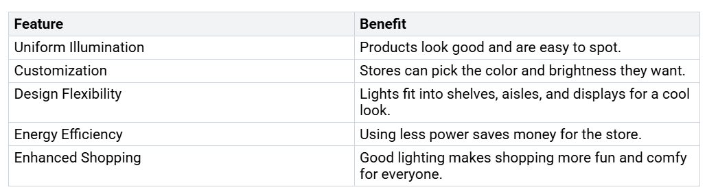 Ang mga tindahan ay gumagamit ng linear lighting upang ipakita ang mga produkto at gawing masaya ang pamimili. Maliwanag, kahit na ang ilaw ay tumutulong sa mga customer na makita ang lahat nang malinaw. Walang mga madilim na lugar o malupit na mga anino. AngIpinapakita sa talahanayan sa ibaba kung paano tumutulong ang linear lighting na mga tindahan: